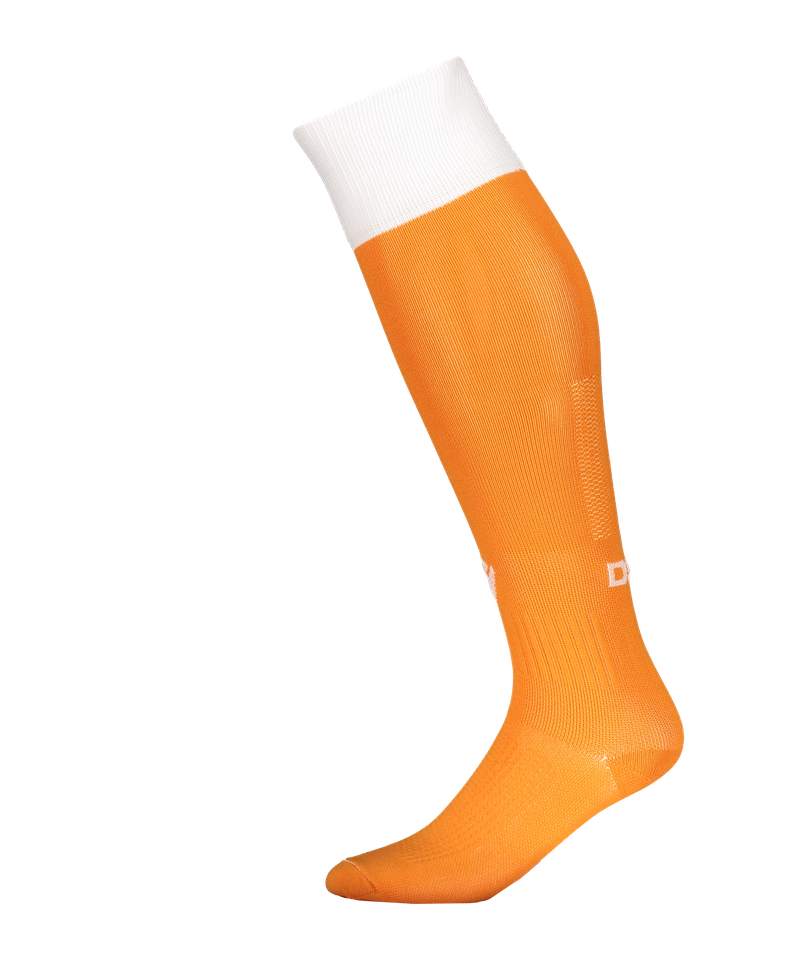 Orange or neon green socks with white elasticated cotton foot. Fluorescent yellow fluorescent green or orange football socks. Soft Polyamid front leg for extra comfort.